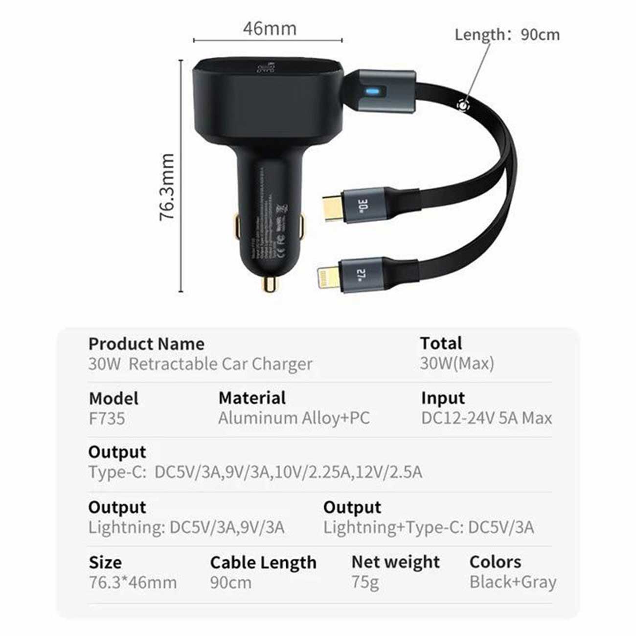 ProOne PCG26 Enjoyment Retractable 30W 2-in-1 Car Charger with Type-C and Lightning Cable
